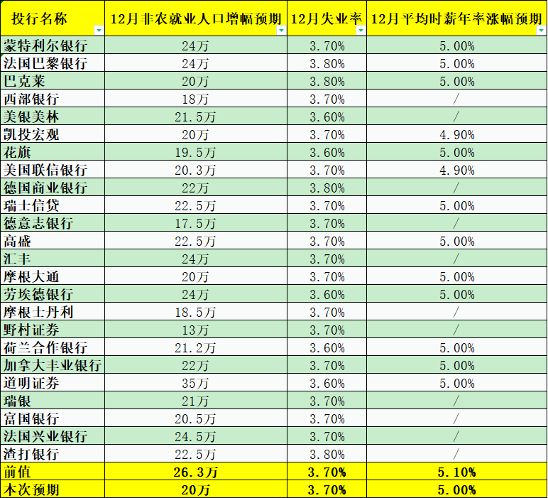 24家投行前瞻12月非农:增速料进一步放缓,黄金有望获得提振 Jan 05,2023 汇通财经APP讯——北京时间周五(1月6日)21:30,美国将公布12月季调后非农就业人口变动和失业率。周四(1月5日),包括摩根士丹利在内的24家大型投行发表了对此次数据的前瞻,具体如下。24家大型投行预测显示,主要投行认为12月非农增速进一步下滑,但投行之间的增幅预期差距较大。具体而言,投行预测美国12月季调后非农就业人口增幅料介于13万-35万(前值26.3万),失业率料介于3.6%-3.8%(前值3.7%),平均时薪年率增幅料介于4.9%-5.0%(前值5.1%)。和前值相比,投行认为12月非农增速进一步放缓,相比之下失业率和平均时薪年率和前值相差不大。若数据显示12月非农增幅真如投行预测那样继续放缓,黄金有望获得支撑。