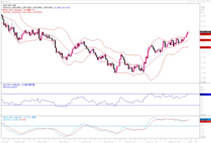 技术层面上,日线级别图上,短期均线继续向上发散提供支持,并向上突破1850,黄金价格沿着布林带上轨保持着良好的上行态势。4小时图上,MACD零轴上方运行,下方首要支撑1849,第二支撑在1835-1840;而上方阻力依次在1865、1873-1880。