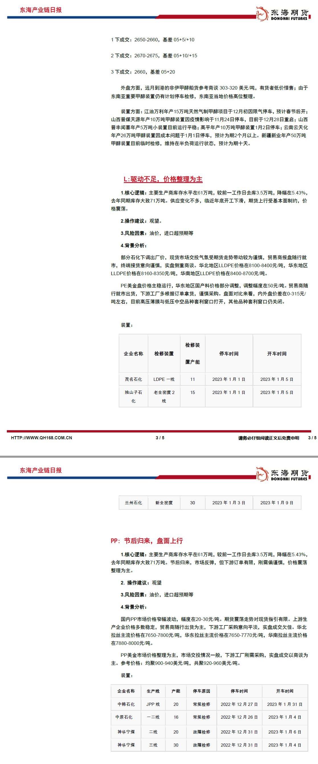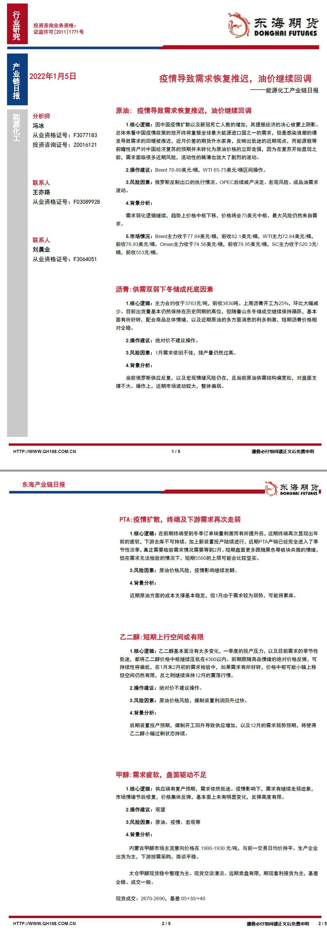 【东海期货1月5日产业链日报】能化篇:疫情导致需求恢复推迟,油价继续回调 Jan 05,2023 汇通财经APP讯——原油: 疫情导致需求恢复推迟,油价继续回调沥青:供需双弱下冬储成托底因素PTA:疫情扩散,终端及下游需求再次走弱乙二醇:短期上行空间或有限甲醇:需求疲软,盘面驱动不足L:驱动不足,价格整理为主PP: 节后归来,盘面上行东海期货公司授权文本由“专注期货开户交易及专业行情分析资讯网站”:【一期货 www.1qh.cn】转发