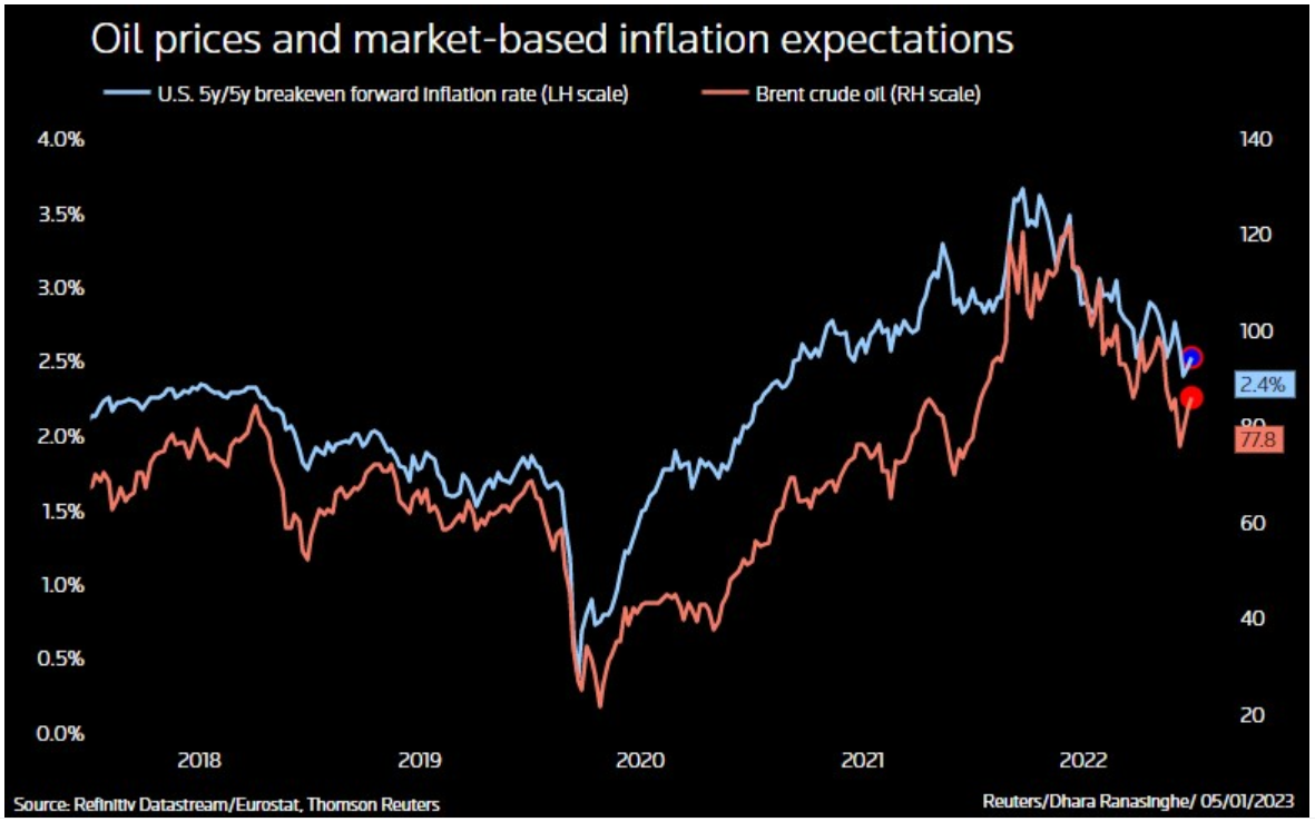(布伦特原油与5年-5年远期通胀预期的对比)