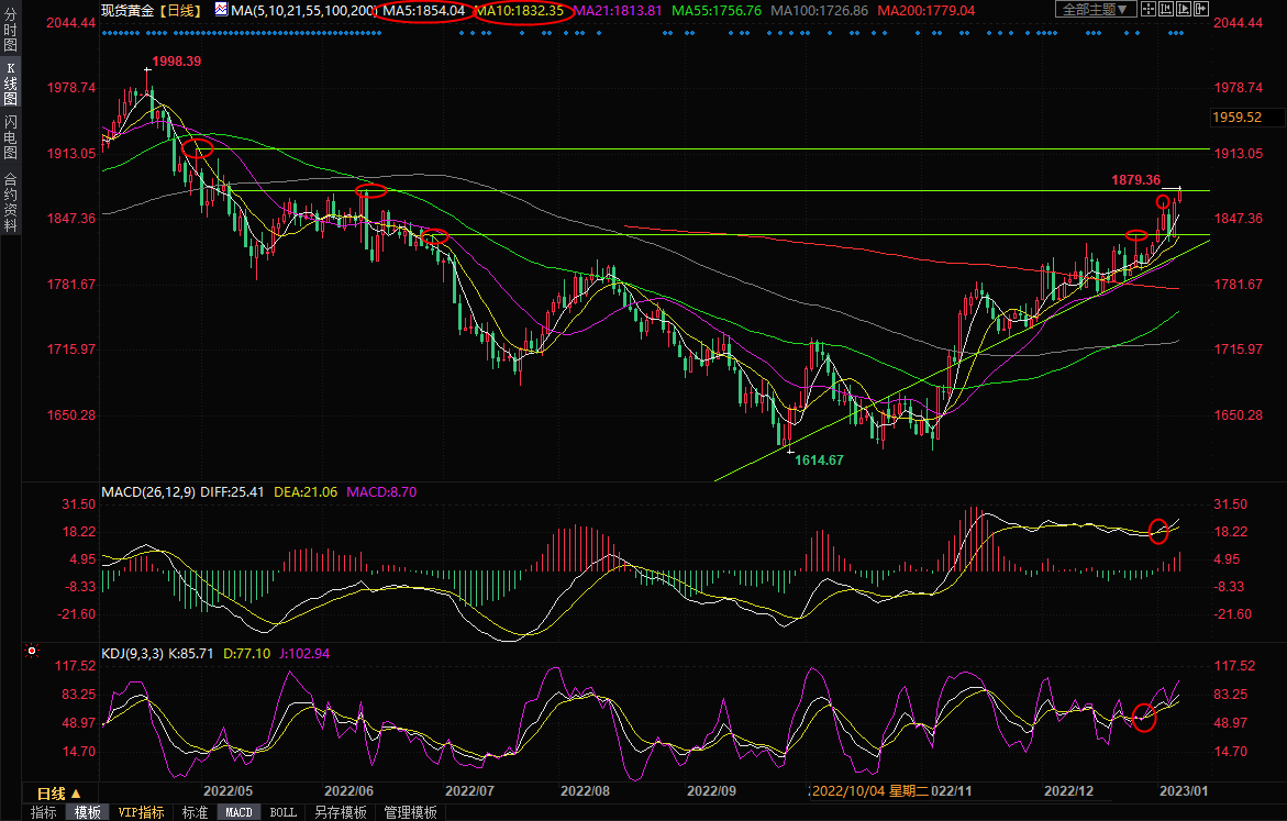 日线级别:单边上涨;MACD金叉,KDJ金叉,短期均线多头排列,目前正策略近半个月高点1878.65附近阻力,若能站稳在该位置上方,后市则有望进一步试探1900关口附近阻力,甚至是涨向1920关口附近,4月29日高点阻力也在该位置附近。