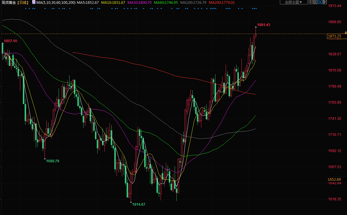金价周一小涨,盘中稍早触及八个月最高后略有回落,美元疲软带来的提振被美联储官员重申抗通胀激进立场部分抵消。现货金上涨0.3%,至每盎司1,870.45美元,盘中稍早曾触及5月9日以来最高的1881.5美元。