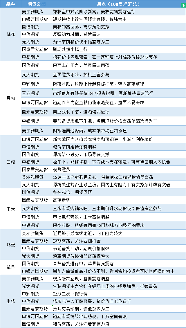 期货公司观点汇总一张图:1月10日农产品(棉花、豆粕、白糖、玉米、鸡蛋、生猪等) Jan 10,2023 汇通财经APP讯——期货公司观点汇总一张图:1月10日农产品(棉花、豆粕、白糖、玉米、鸡蛋、生猪等)