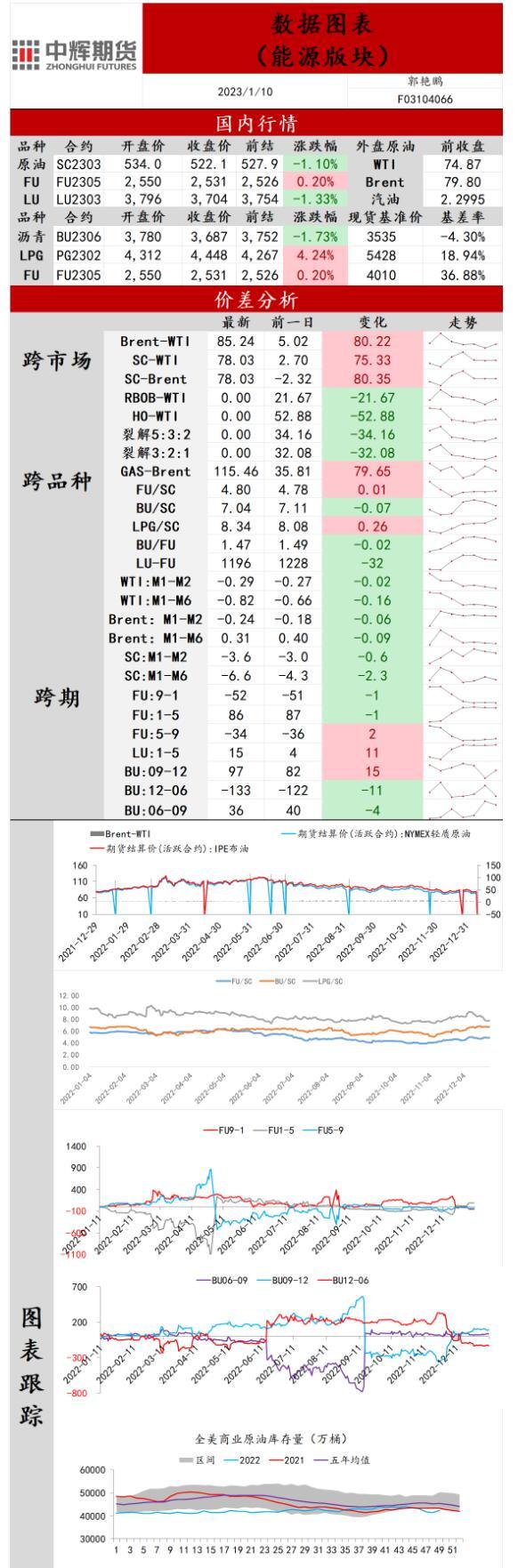 供应端:据美国能源信息署最新数据显示,截止2022年12月30日当周,包括战略储备在内的美国原油库存总量79302.6万桶,比前一周下降105.4万桶;美国商业原油库存42064.6万桶,比前一周上升169.4万桶;战略原油库存量37238万桶,比上一周下降274.8万桶;美国汽油库存总量22266.2万桶,比前一周下降34.6万桶。商业原油库存比去年同期高0.67%,比过去五年同期低4.80%;汽油库存比去年同期低4.35%,比过去五年同期低约5.24%;馏分油库存比去年同期低6.35%,比过去五年同期低12.20%。