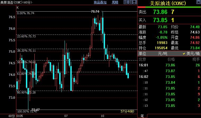 北京时间16:03,NYMEX原油期货下跌0.88%至73.95美元/桶;ICE布伦特原油期货下跌1.01%至78.85美元/桶。
