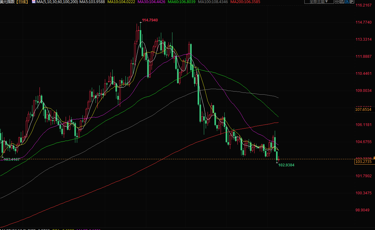 美元指数上涨0.039%,报103.21,前一交易日下跌0.7%,触及七个月最低102.93。该指数追踪美元兑一篮子货币的走势,其中欧元的权重最大。目前还不清楚美元的避险地位对后市将带来帮助还是造成伤害。