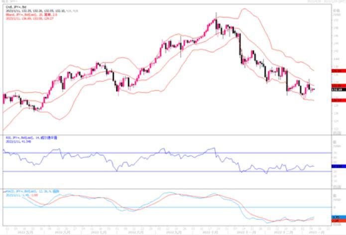 周二(1月10日)在美国公布CPI消费物价指数之前,市场交投较为谨慎,美元兑日元当日略有回升0.28%,收盘于132.25。目前越来越多的观点认为,日本央行本月货币政策会议上将上调物价上涨率预期。投资者预测大规模货币政策面临进一步调整,意识到日美利差将缩小,令抛售美元兑日元的动向增强。若本周四美国消费物价数据呈下滑,则可能大概率加剧美元兑日元的下滑态势。技术层面上,日图整体维持下行走势,在MA20受阻回落后弱势震荡,仍偏下行。4小时图在132.65-131.30区间震荡,仍倾向下行突破。且整体上,美元兑日元都处在布林带通道下轨,整个下行通道保持完好,上方135之下似乎形成了短期的双顶,只要震荡整理回不到该水平之上,则交易节奏逢高空美元似乎更受市场欢迎。