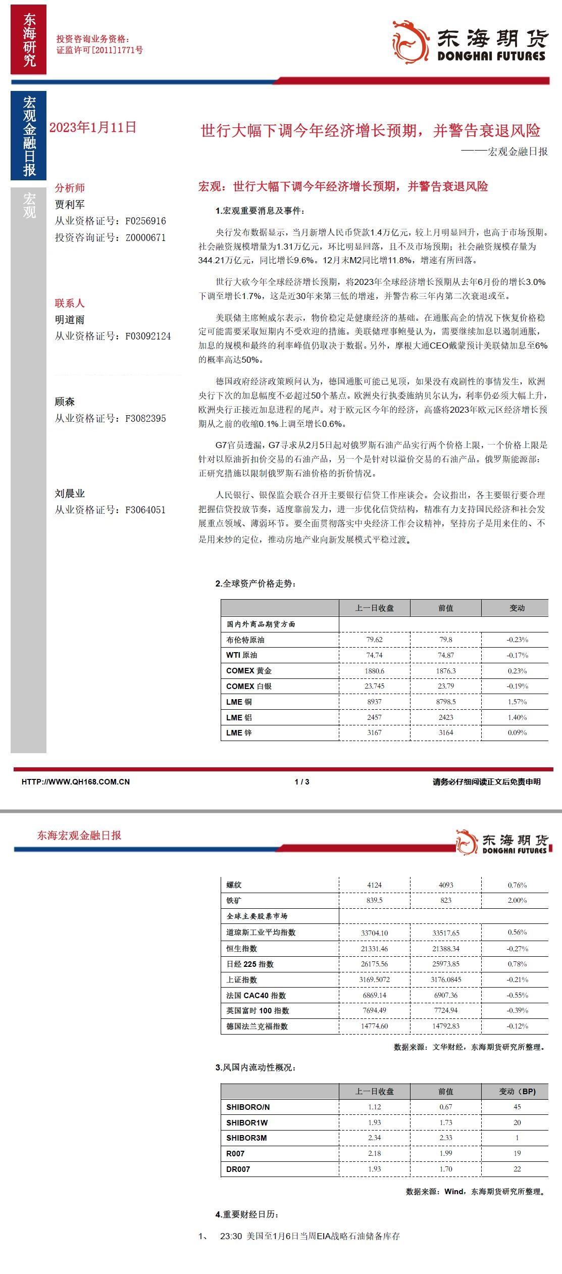 【东海期货1月11日宏观金融日报】世行大幅下调今年经济增长预期,并警告衰退风险 Jan 11,2023 汇通财经APP讯——美联储主席鲍威尔表示,物价稳定是健康经济的基础。在通胀高企的情况下恢复价格稳定可能需要采取短期内不受欢迎的措施。美联储理事鲍曼认为,需要继续加息以遏制通胀,加息的规模和最终的利率峰值仍取决于数据。另外,摩根大通CEO戴蒙预计美联储加息至6%的概率高达50%。重要财经日历:23:30 美国至1月6日当周EIA战略石油储备库存东海期货公司授权文本由“专注期货开户交易及专业行情分析资讯网站”:【一期货 www.1qh.cn】转发