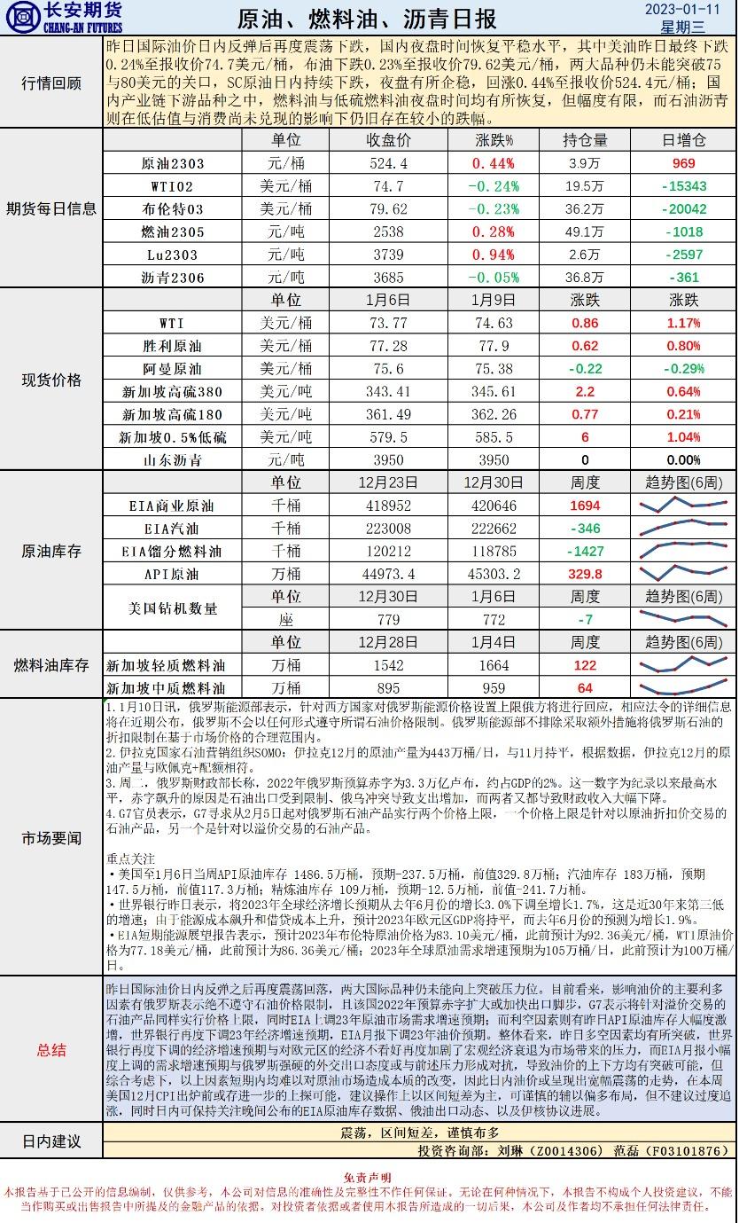 长安期货原油早评:建议区间短差,谨慎布多 Jan 11,2023 汇通财经APP讯——1月11日,长安期货发布原油早评,认为原油将震荡,建议区间短差,谨慎布多。长安期货公司授权文本由“专注期货开户交易及专业行情分析资讯网站”:【一期货 www.1qh.cn】转发