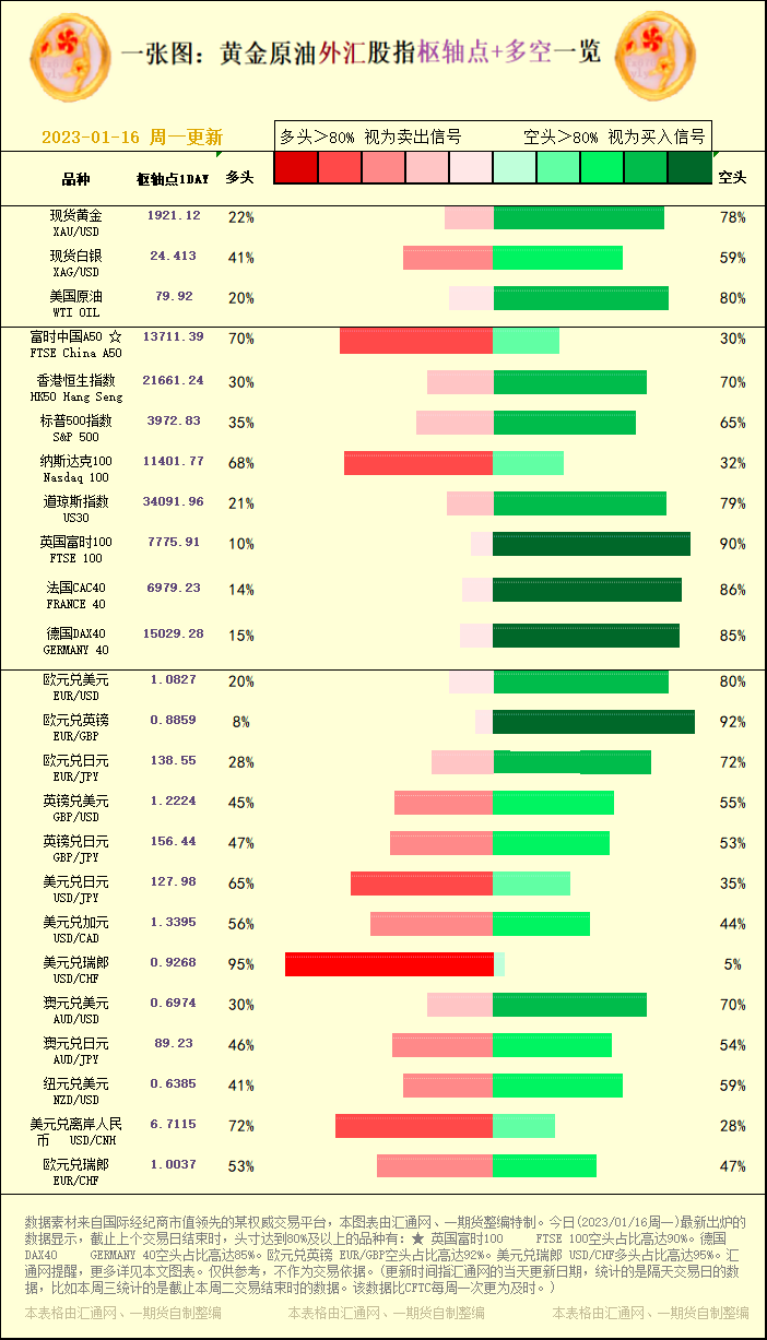 一张图:黄金原油外汇股指"枢纽点+多空占比"一览(2023/01/16周一) Jan 16,2023 汇通财经APP讯——一张图:黄金原油外汇股指"枢纽点+多空占比"一览。今日(2023/01/16周一)最新出炉的数据显示,截止上个交易日结束时,头寸达到80%及以上的品种有:★ 英国富时100 FTSE 100空头占比高达90%。德国DAX40 GERMANY 40空头占比高达85%。欧元兑英镑 EUR/GBP空头占比高达92%。美元兑瑞郎 USD/CHF多头占比高达95%。汇通网提醒,更多详见本文图表。仅供参考,不作为交易依据。【本图表涉及到的交易品种有:现货黄金、现货白银、美国原油、富时中国A50、香港恒生指数、标普500指数、纳斯达克指数、道琼斯指数、英国富时100、法国CAC40、德国DAX40、欧元兑美元、欧元兑英镑、欧元兑日元、英镑兑美元、英镑兑日元、美元兑日元、美元兑加元、美元兑瑞郎、澳元兑美元、澳元兑日元、纽元兑美元、美元兑离岸人民币、欧元兑瑞郎。】(更新时间指汇通网的当天更新日期,统计的是隔天交易日的数据,比如本周三统计的是截止本周二交易结束时的数据。该数据比CFTC每周一次更为及时。)