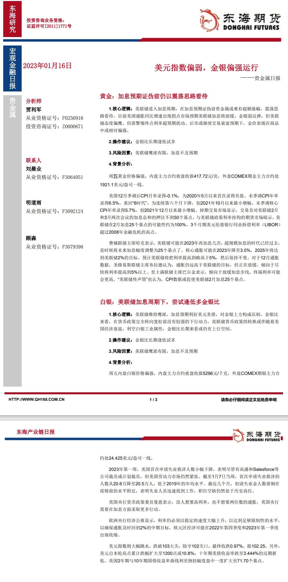 【东海期货1月16日产业链日报】贵金属篇:美元指数偏弱,金银偏强运行 Jan 16,2023 汇通财经APP讯——黄金:加息预期证伪前仍以震荡思路看待。白银:美联储加息周期下,尝试逢低多金银比。东海期货公司授权文本由“专注期货开户交易及专业行情分析资讯网站”:【一期货 www.1qh.cn】转发