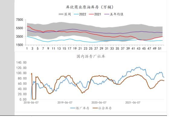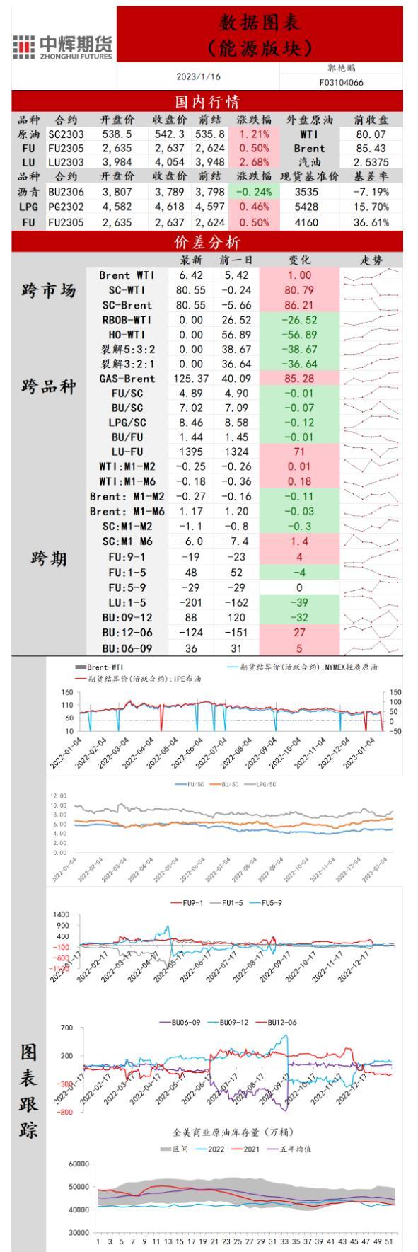 供应端:据美国能源信息署最新数据显示,截止2023年1月6日当周,包括战略储备在内的美国原油库存总量81118.7万桶,比前一周上升1816.1万桶;美国商业原油库存43960.7万桶,比前一周上升1896.1万桶;战略原油库存量37158万桶,比上一周下降80万桶;美国汽油库存总量22677.6万桶,比前一周上升411.4万桶。商业原油库存比去年同期高6.37%,比过去五年同期高0.41%;汽油库存比去年同期低5.80%,比过去五年同期低约6.97%;馏分油库存比去年同期低9.02%,比过去五年同期低17.10%。