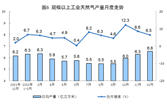 天然气生产增速有所放缓,进口降幅扩大。12月份,生产天然气204亿立方米,同比增长6.5%,增速比上月放缓2.1个百分点,日均产量6.6亿立方米。进口天然气1028万吨,同比下降11.8%降幅比上月扩大9.0个百分点。