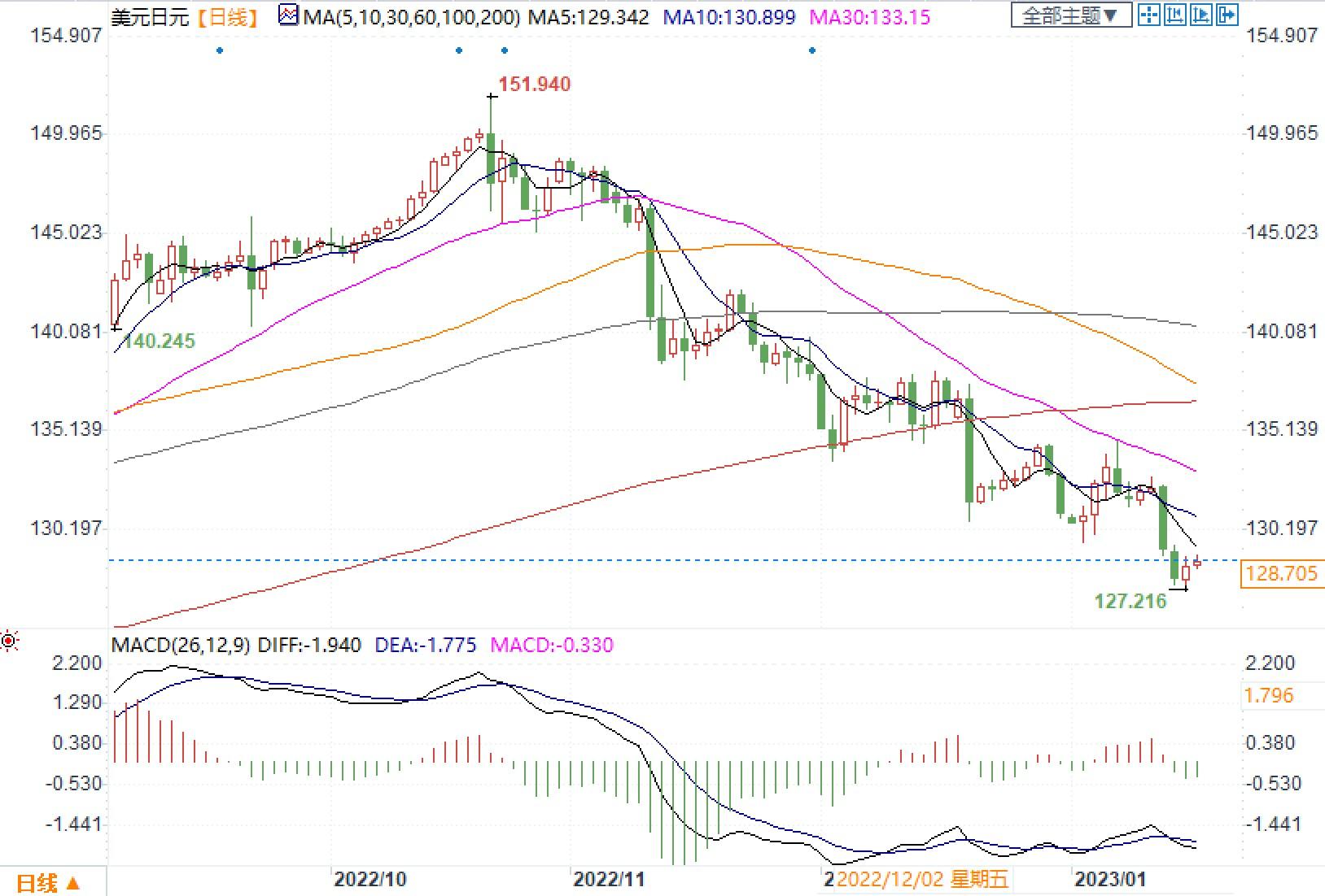 北京时间1月17日11:30,美元兑日元报128.705