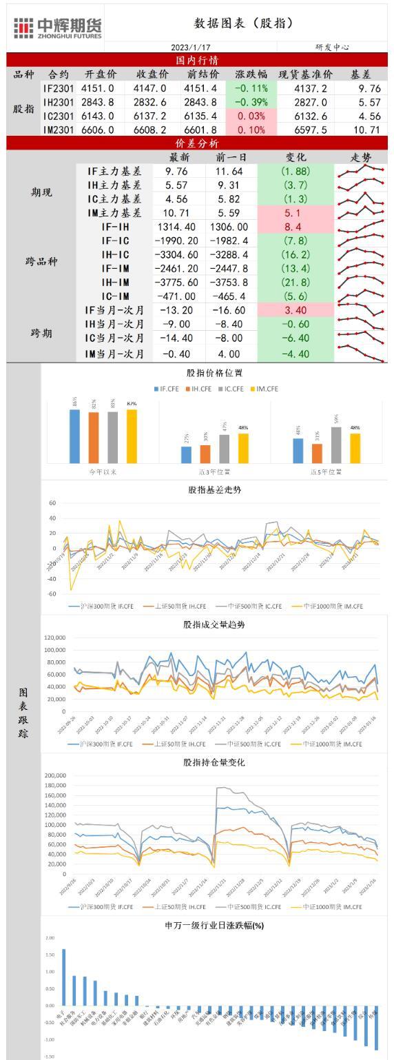 2、今日三大指数小幅低开,指数走势分化,沪指在消费和金融权重股的拖累下保持低位震荡,半导体赛道股的走强带动深证成指和创业板指偏强震荡,午后两市快速回落但在券商股的拉动下跌幅有所收窄。市场情绪降温,两市成交额回落至7000亿元左右。但北向资金未受大盘影响,全天仍坚持单边扫货节奏,净流入近百亿。隔夜因公休日马丁?路德?金日,美股和美债休市。欧股在房地产板块的带领下收涨,欧洲长期国债普遍继续回升,短债收益率盘中回落。近期影响市场表现的主要使美联储央行在未来的加息路径,投资者关注持续的高利率水平是否会对企业盈利造成持续下行风险,美股财报季拉开帷幕,市场短期内或将受到上市公司披露季度业绩的扰动。国内今日公布12月消费,投资和工业增加值等经济数据,整体来看受到疫情政策调整的影响仍在低位徘徊,基建和制造业保持较强的韧性,但房地产投资创下年内新低,12月消费和服务仍受疫情扰动影响维持负增长区间,四季度GDP受到国内消费,进出口等的拖累增速回落至2.9%。经济数据落地后,市场缩量调整,但调整幅度有限,预计在悲观情绪释放后,投资者更加关注2023年的边际改善情况,股指震荡整理后仍具备上涨基础。申万一级31个行业中8个行业上涨,其中电子行业领涨,传媒行业领跌。