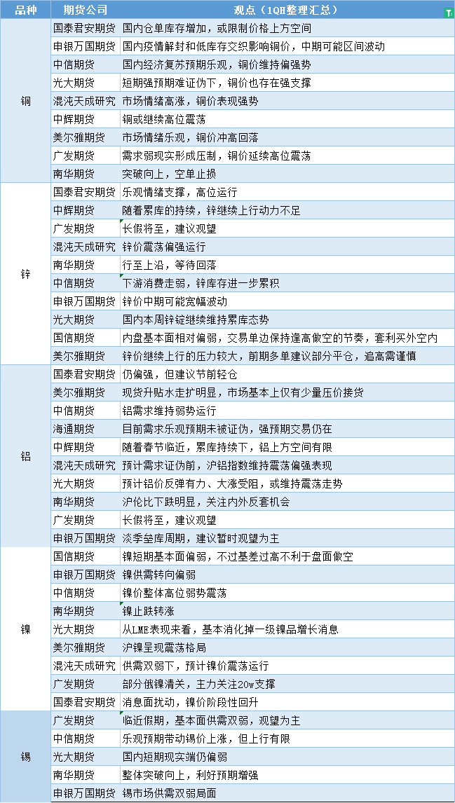 标题:期货公司观点汇总一张图:1月19日有色系(铜、锌、铝、镍、锡等)