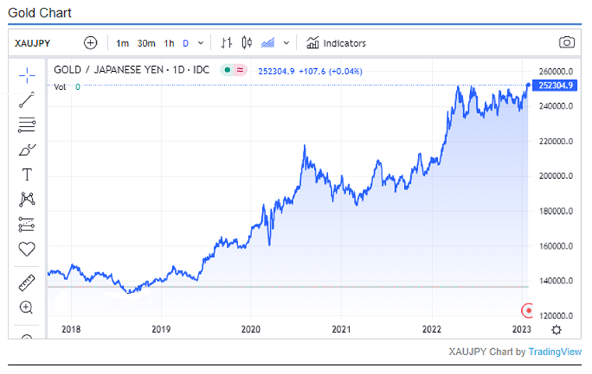 以日元计价的现货黄金(以盎司计算)目前非常接近2022年4月的历史高位。2022年4月,以日元计价的现货黄金价格达到每盎司254,220日圆(1962美元)以上的历史高位。周三,现货黄金的最高水平为每盎司252,600日元(1950美元)。