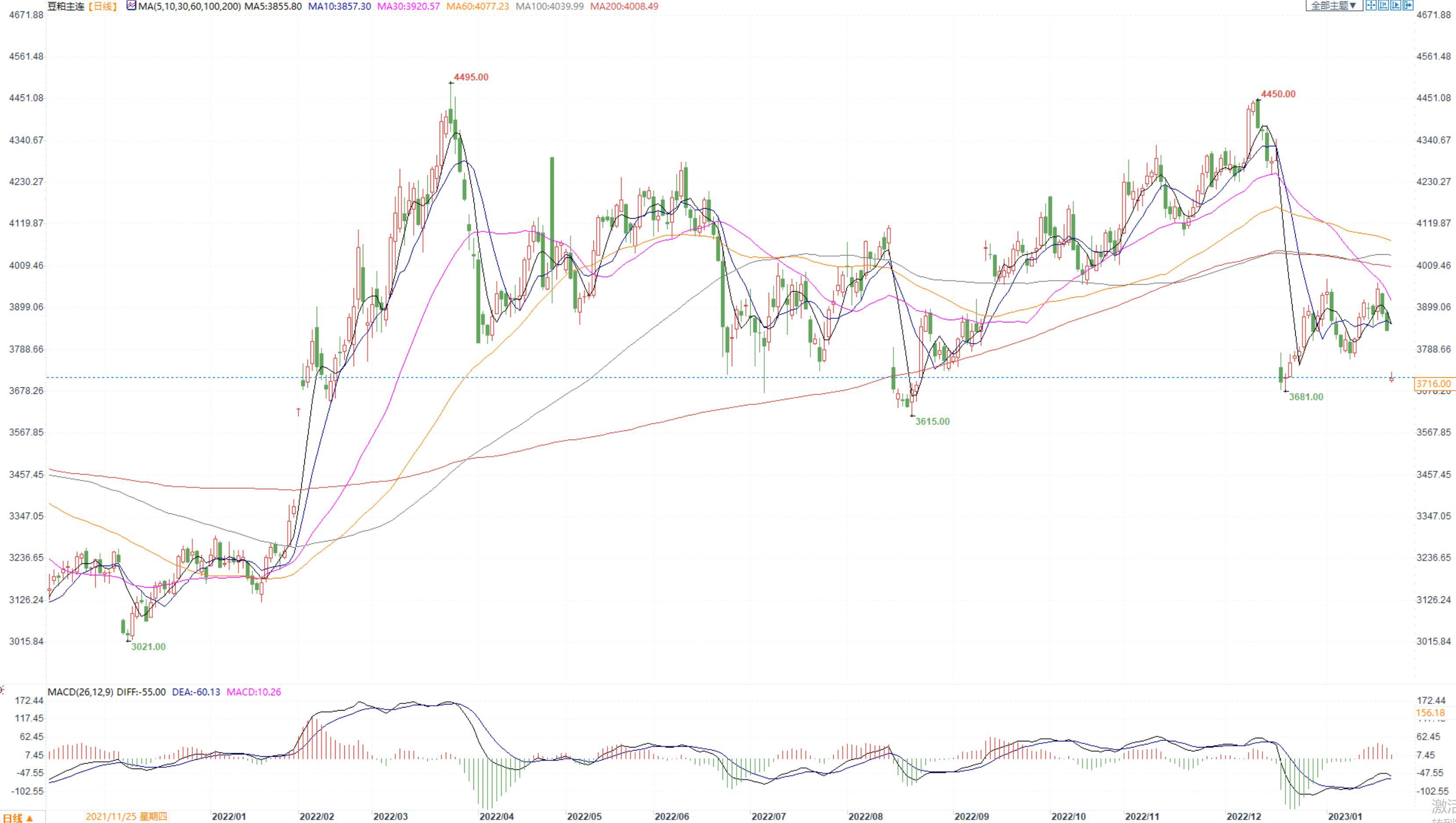 【今日行情】金银全线收涨。AU2304收盘价为422.68,收涨0.09%;AG2306收盘价为5243,收涨0.31%。美元指数小幅反弹,但仍处于102下方,十年期美债收益率在3.5%附近窄幅震荡,中期两大指数预计均将弱势运行,对金银以支撑为主。