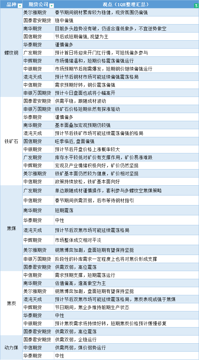 期货公司观点汇总一张图:1月30日黑色系(螺纹钢、焦煤、焦炭、铁矿石、动力煤等) Jan 30,2023 汇通财经APP讯——期货公司观点汇总一张图:1月30日黑色系(螺纹钢、焦煤、焦炭、铁矿石、动力煤等)