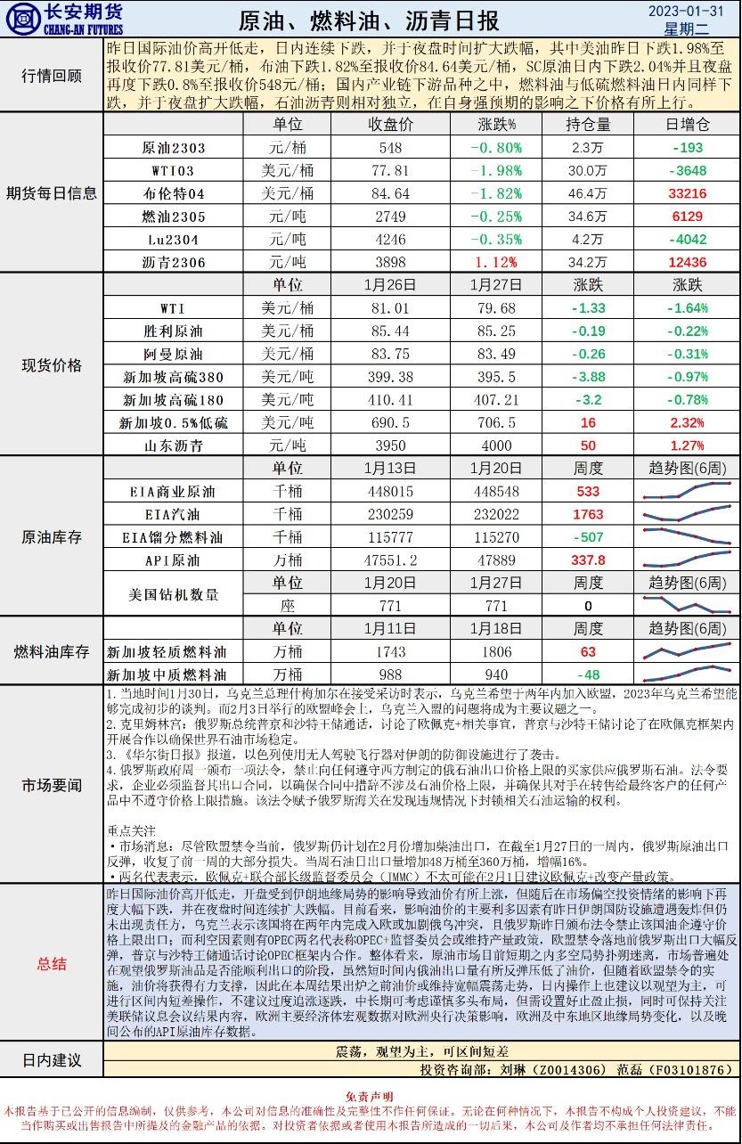 长安期货原油早评:多空交织前景仍需观望,可区间短差 Jan 31,2023 汇通财经APP讯——1月31日,长安期货发布原油早评,称高开低走考验下方支撑,多空交织前景仍需观望,可区间短差。 长安期货公司授权文本由“专注期货开户交易及专业行情分析资讯网站”:【一期货 www.1qh.cn】转发