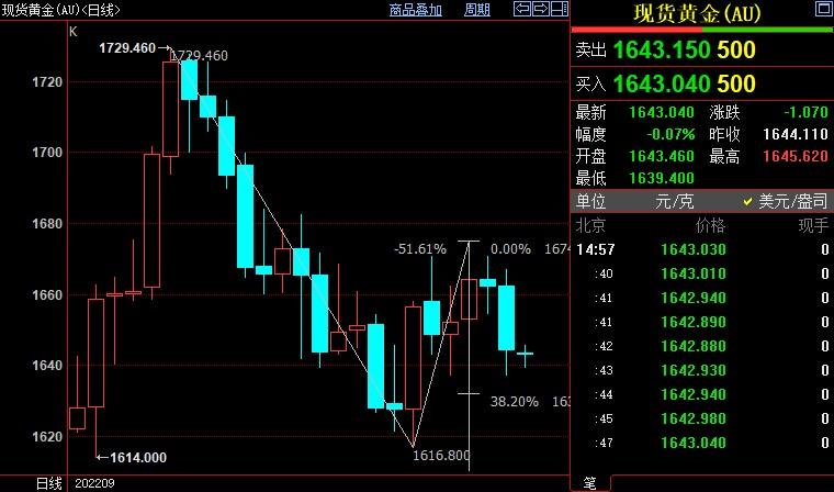 北京时间19:59,现货黄金下跌0.32%至1639.75美元/盎司;COMEX期金主力合约下跌0.11%至1643.0美元/盎司;美元指数上涨0.41%至111.128。