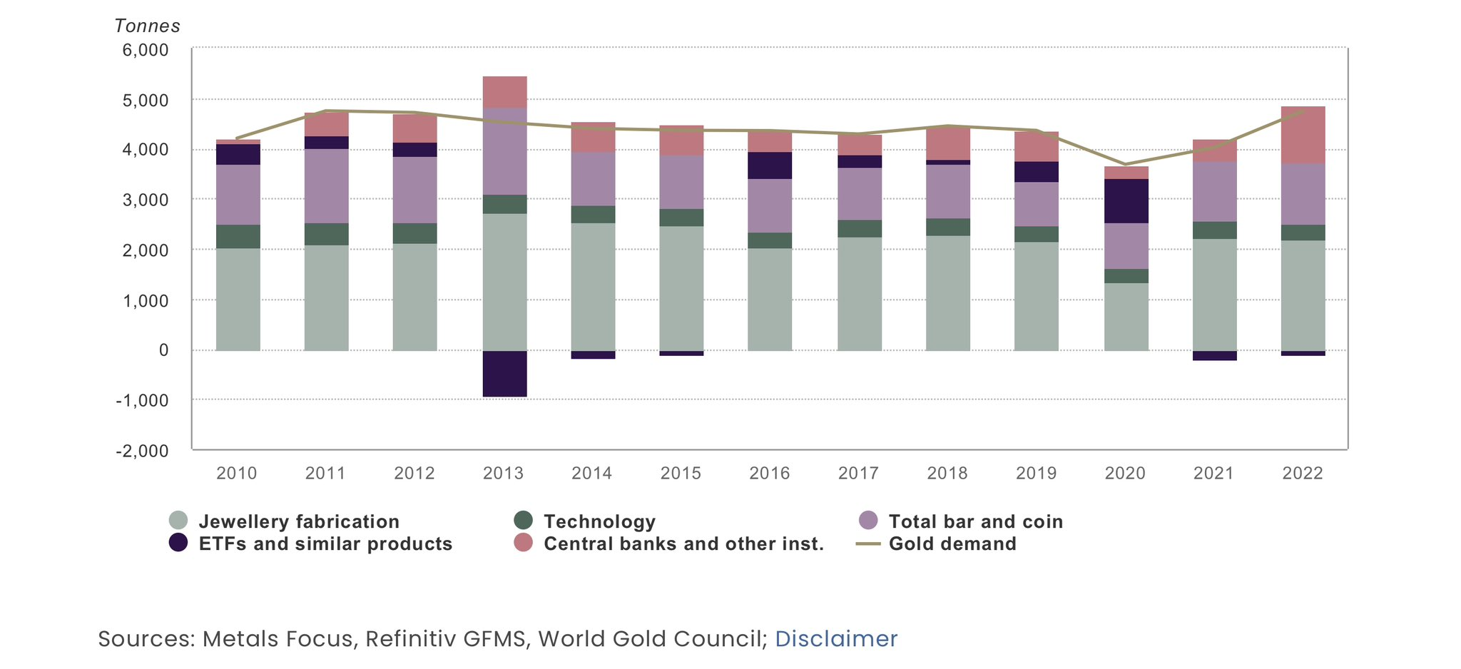 供应方面,2022年全球黄金总供应量增加2%,至4755吨,仍高于疫情前水平,金矿产量增至3612吨,创四年最高水平。