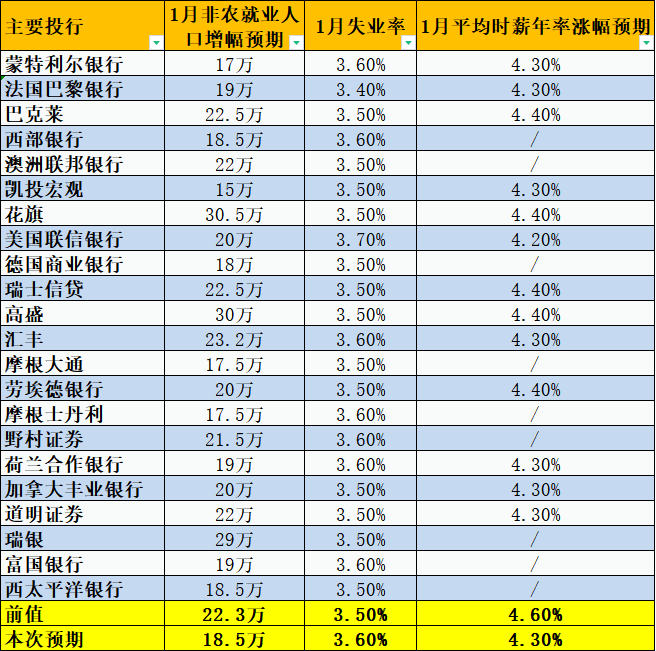 22家投行预测1月非农:增幅料进一步缩小,黄金有望获得支撑 Feb 02,2023 汇通财经APP讯——北京时间周五(2月3日)21:30,美国将公布1月季调后非农就业人口变动和失业率。周四(2月2日),包括摩根士丹利在内的22家大型投行发表了对此次数据的前瞻,具体如下。22家大型投行预测显示,多数投行认为1月非农增速进一步下滑,但投行之间的增幅预期差距较大。具体而言,美国1月季调后非农就业人口增幅料介于15万-30.5万(前值22.3万),失业率料介于3.4%-3.7%(前值3.5%),平均时薪年率增幅料介于4.3%-4.4%(前值4.6%)。若数据显示1月非农增幅真如投行预测那样下滑,黄金有望获得支撑。