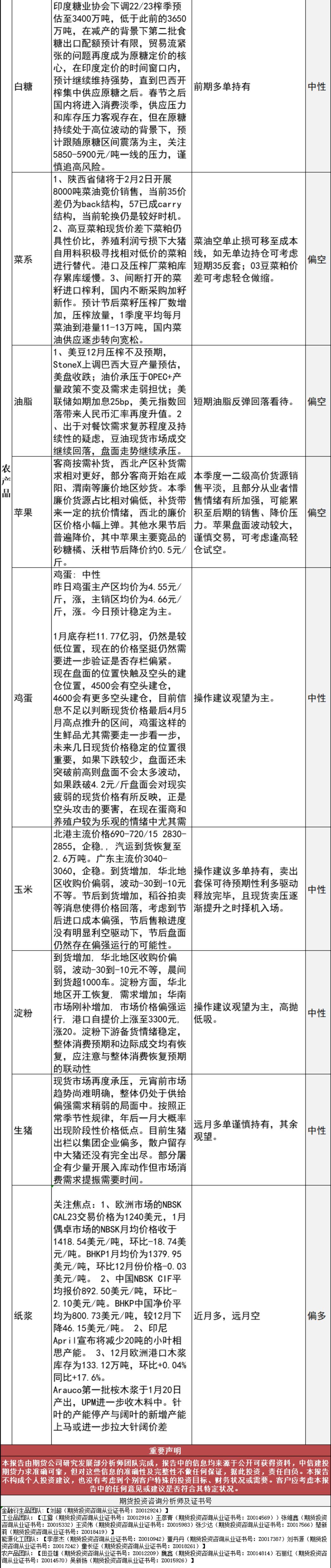 鸡蛋:鸡蛋这样的生鲜品尤其需要走一步看一步,未来几日现货价格稳定的位置很重要,如果下跌较少,盘面还未突破前高则盘面不会太多波动,如果跌破 4.2 元/斤盘面会对现实疲弱的现货价格有所反映,正是空头攻击的要害,在现在蛋商和养殖户较为乐观的情绪中尤其需要有所警惕,建议观望为主。