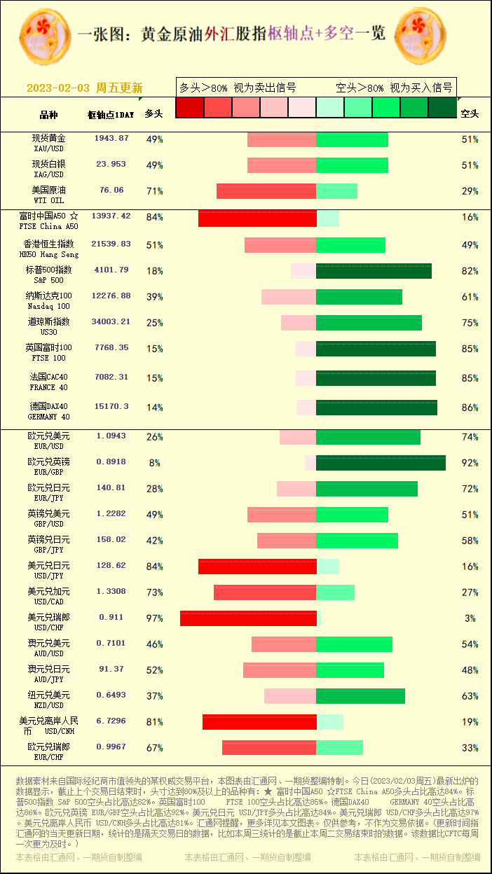 汇通财经APP讯——一张图:黄金原油外汇股指"枢纽点+多空占比"一览。今日(2023/02/03周五)最新出炉的数据显示,截止上个交易日结束时,头寸达到80%及以上的品种有:★ 富时中国A50 ☆FTSE China A50多头占比高达84%。