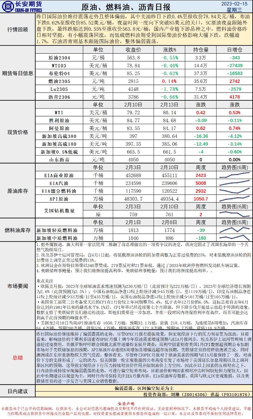 长安期货原油早评:价格偏弱震荡,建议区间偏空短差为主 Feb 15,2023 汇通财经APP讯——2月15日,长安期货发布原油早评,称加息延续或持续压制油价,预测价格偏弱震荡,建议区间偏空短差为主。长安期货公司授权文本由“专注期货开户交易及专业行情分析资讯网站”:【一期货 www.1qh.cn】转发