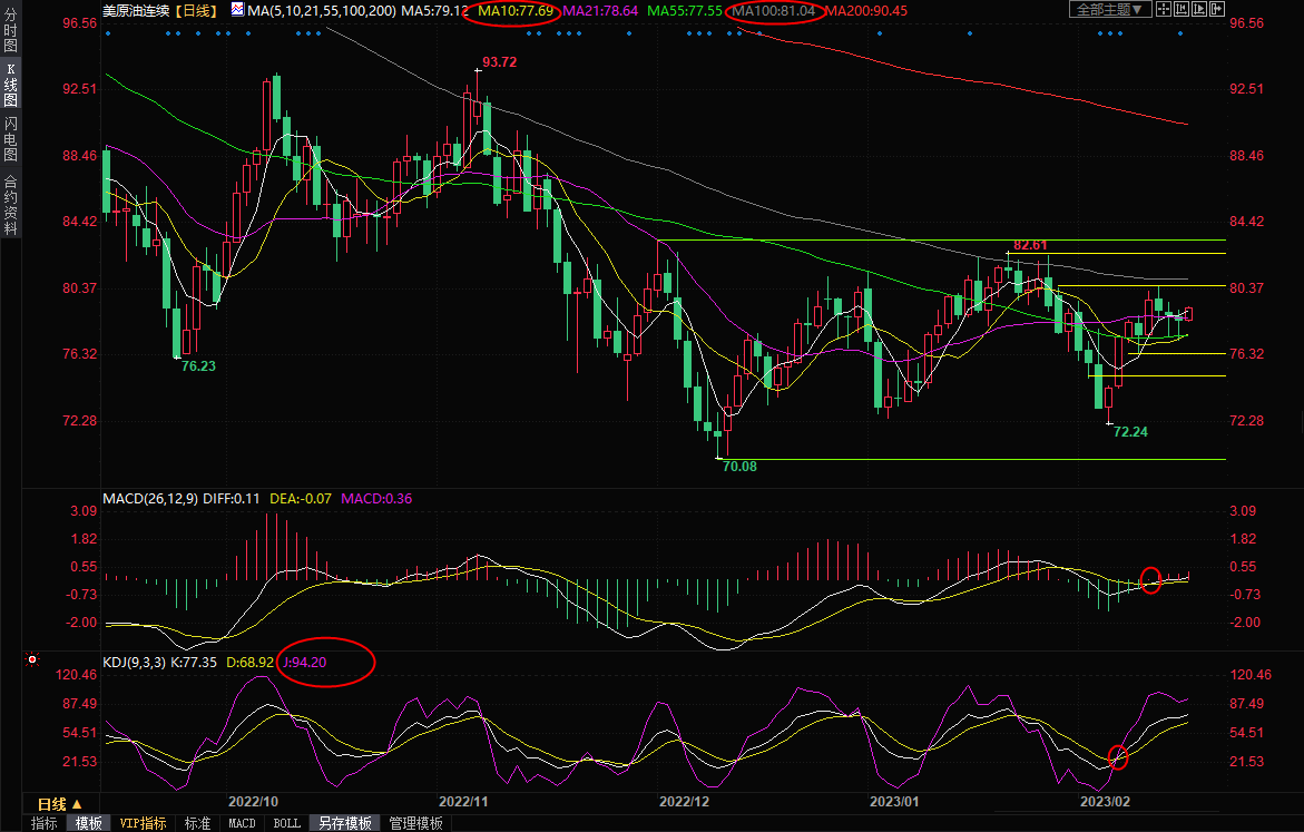 日线级别:震荡;MACD金叉,KDJ金叉,虽然之前油价在100日均线附近受阻后回落,但10日均线给油价提供了较好的支撑,连续两个交易日探底回升后,油价有望延续72.24以来的涨势,初步阻力在周二高点79.60附近,然后是80整数关口,较强的阻力在100日均线81.04附近,若能顶破该阻力,则增加短线看涨信号;进一步阻力在1月23日高点82.61附近,12月1日高点阻力在83.31附近。