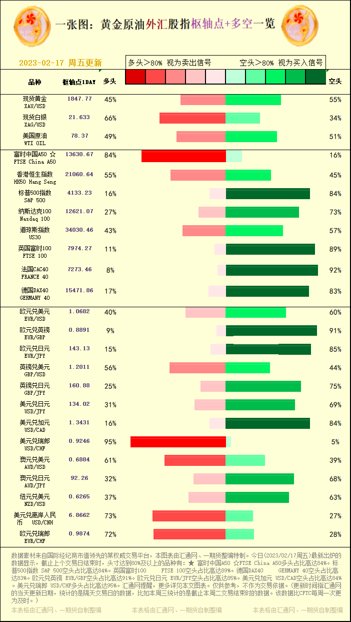 汇通财经APP讯——一张图:黄金原油外汇股指"枢纽点+多空占比"一览。今日(2023/02/17周五)最新出炉的数据显示,截止上个交易日结束时,头寸达到80%及以上的品种有:★ 富时中国A50 ☆FTSE China A50多头占比高达84%。