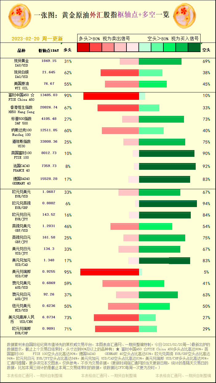 汇通财经APP讯——一张图:黄金原油外汇股指"枢纽点+多空占比"一览。今日(2023/02/20周一)最新出炉的数据显示,截止上个交易日结束时,头寸达到80%及以上的品种有:★ 富时中国A50 ☆FTSE China A50多头占比高达90%。