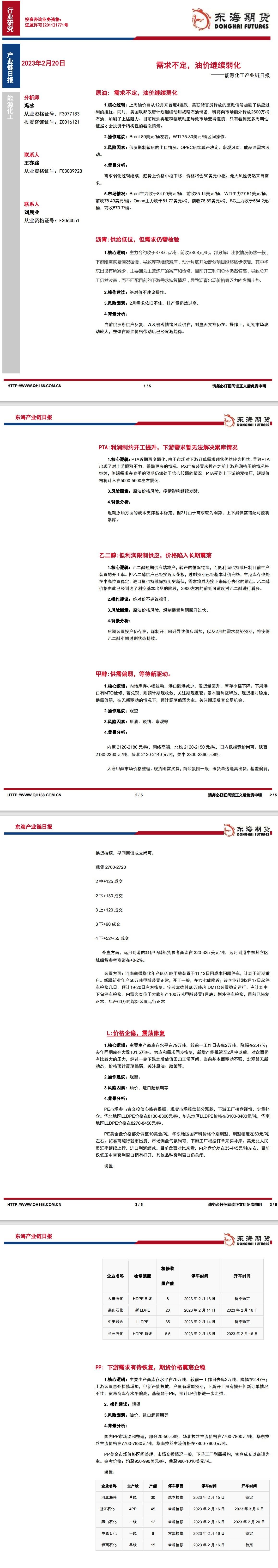 【东海期货2月20日产业链日报】能化篇:需求不定,油价继续弱化 Feb 20,2023 汇通财经APP讯——原油: 需求不定,油价继续弱化。沥青:供给低位,但需求仍需检验。PTA:利润制约开工提升,下游需求暂无法解决累库情况。乙二醇:低利润限制供应,价格陷入长期震荡。甲醇:供需偏弱,等待新驱动。东海期货公司授权文本由“专注期货开户交易及专业行情分析资讯网站”:【一期货 www.1qh.cn】转发