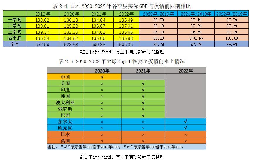 在日本内阁府公布四季度GDP的同时,也意味着日本2022全年GDP数据正式出炉。去年日本实际GDP录得546.05万亿日元,同比增长1%,连续两年正增长。不过,相比其他主要经济体,日本全年增速偏低,新冠疫情、俄乌冲突、日元贬值、人口老龄化对于日本经济产生明显的利空影响。并且从全年口径来看,日本尚未恢复至疫情前同期水平,2022年GDP比2019年依然萎缩了1.2%。放眼全球前十一大经济体,只有日本和英国两个经济体依然没有恢复至疫情前水平;中国是唯一能在疫情爆发当年依然实现正增长的经济体;2021年美国、印度、韩国、澳大利亚、巴西和俄罗斯基本摆脱疫情阴霾;2022年欧元区和加拿大GDP正式超越2019年。