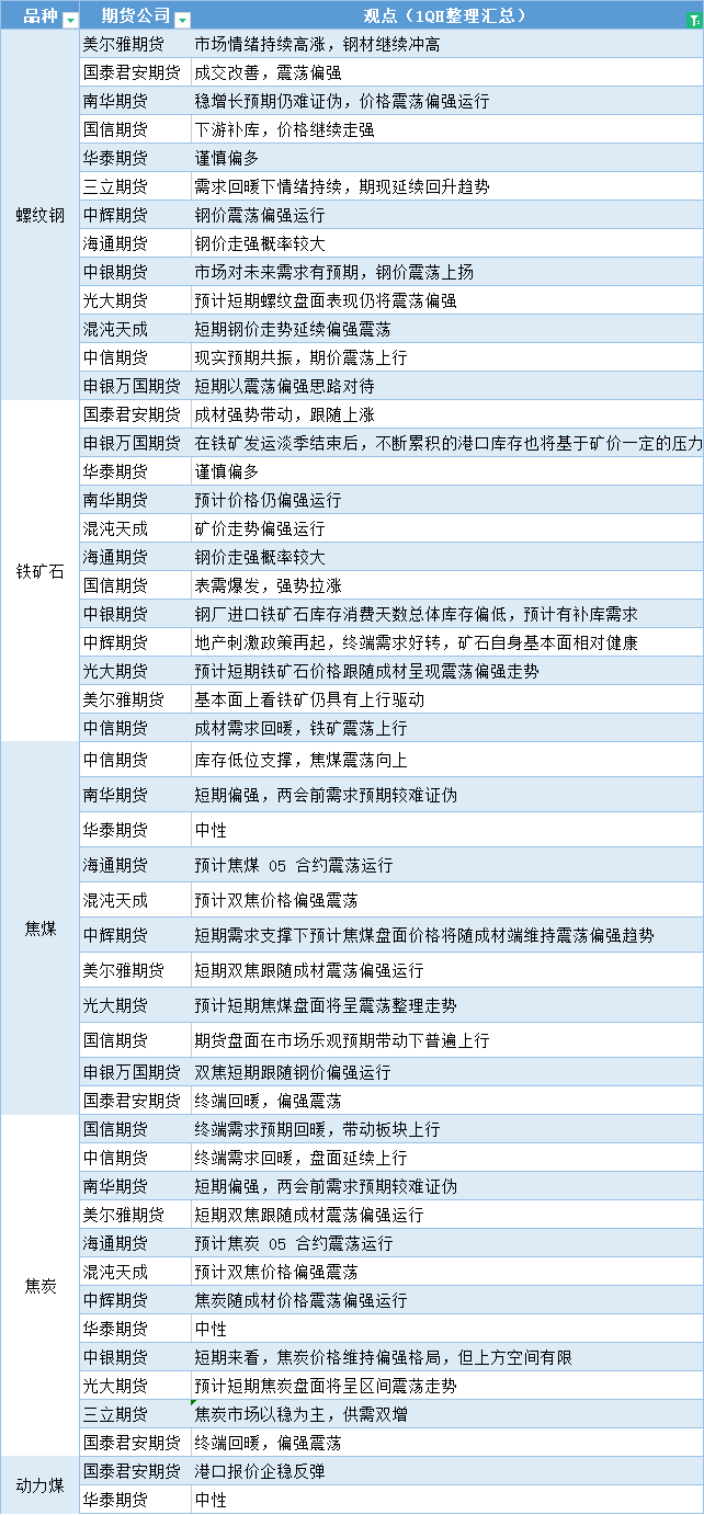 期货公司观点汇总一张图:2月21日黑色系(螺纹钢、焦煤、焦炭、铁矿石、动力煤等) Feb 21,2023 汇通财经APP讯——期货公司观点汇总一张图:2月21日黑色系(螺纹钢、焦煤、焦炭、铁矿石、动力煤等)