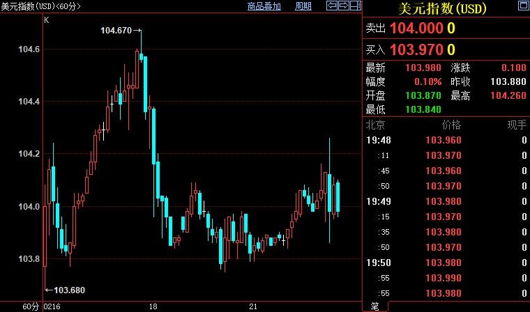 北京时间19:50,现货黄金下跌0.36%至1834.74美元/盎司;COMEX期金主力合约下跌0.35%至1843.7美元/盎司;美元指数上涨0.10%至103.990;英镑兑美元上涨0.64%至1.2115。