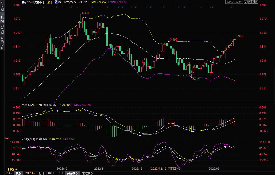 10年期国债收益率达到3.962%,为11月10日以来最高,从1月19日触及的四个月低点3.321%反弹。两年期国债收益率一度高见4.738%,为11月8日以来最高。