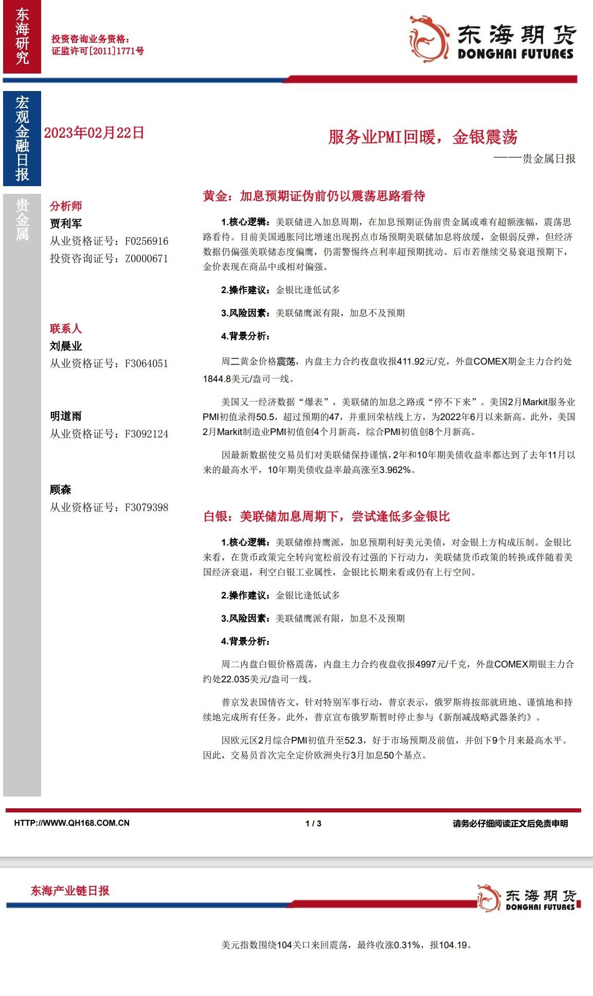【东海期货2月22日产业链日报】贵金属篇:服务业PMI回暖,金银震荡 Feb 22,2023 汇通财经APP讯——黄金:加息预期证伪前仍以震荡思路看待。白银:美联储加息周期下,尝试逢低多金银比。东海期货公司授权文本由“专注期货开户交易及专业行情分析资讯网站”:【一期货 www.1qh.cn】转发