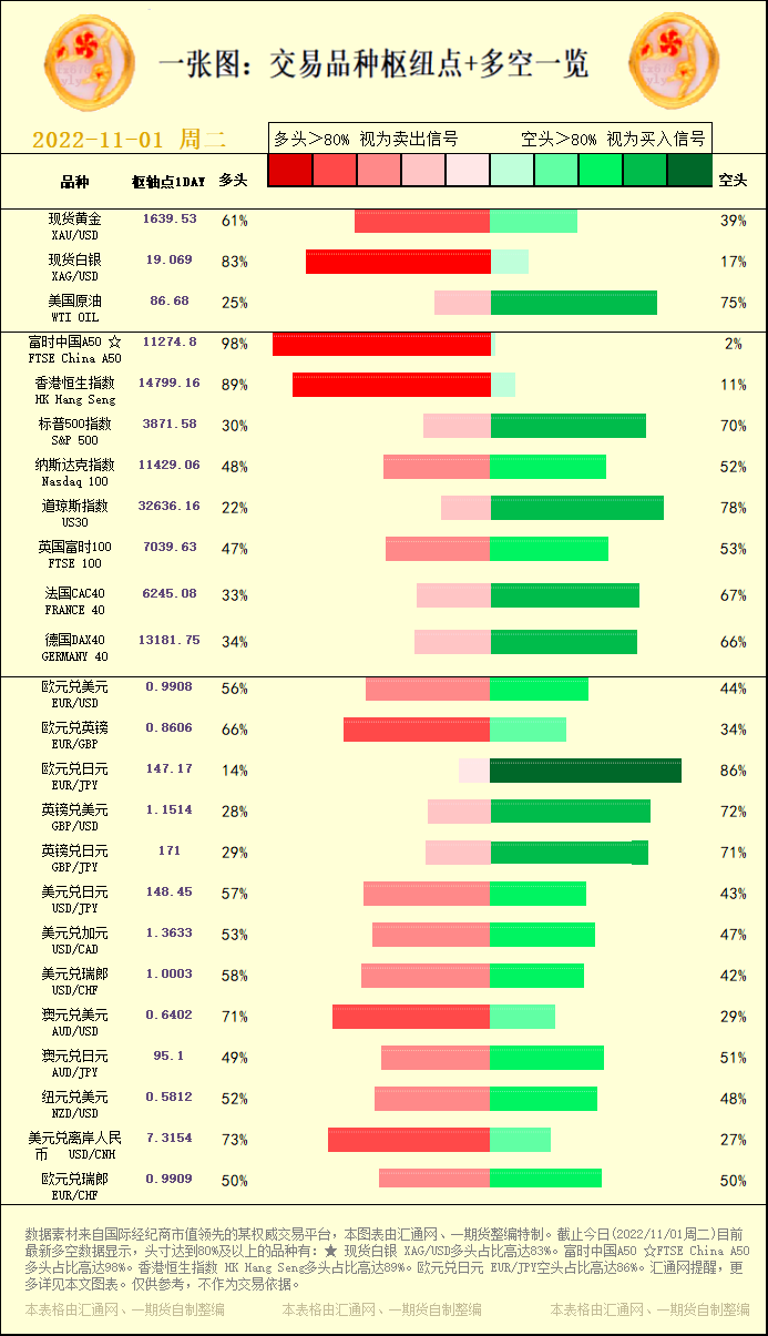一张图:交易品种枢纽点+多空占比一览(2022/11/01周二)。截止今日(2022/11/01周二)目前最新多空数据显示,头寸达到80%及以上的品种有:★