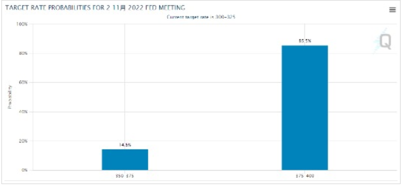目前,业内对经济学家的调查普遍预计,此次美联储再度加息75个基点,上调联邦基金利率目标区间至3.75%-4%,几乎已板上钉钉。芝商所的美联储观察工具显示,今晚美联储有高达85.5%超高概率加息75个基点,而加息50个基点的概率则仅为14.5%。