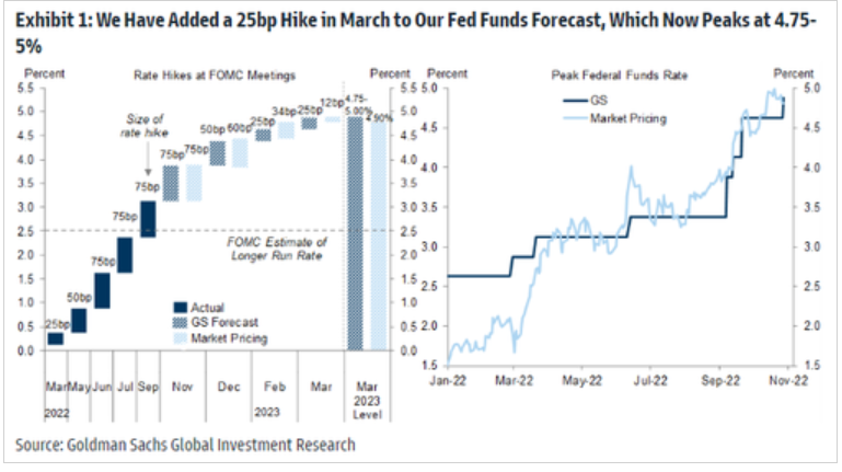 高盛则提出了与上述鹰派观点相左的看法。高盛经济团队虽然预计美联储本周将再度加息75个基点,但认为此后的加息步伐料将放缓。高盛预计,美联储将在12月加息50个基点,并在明年一季度再分别两次加息25个基点,从而令终端利率在明年3月达到4.75%-5%。