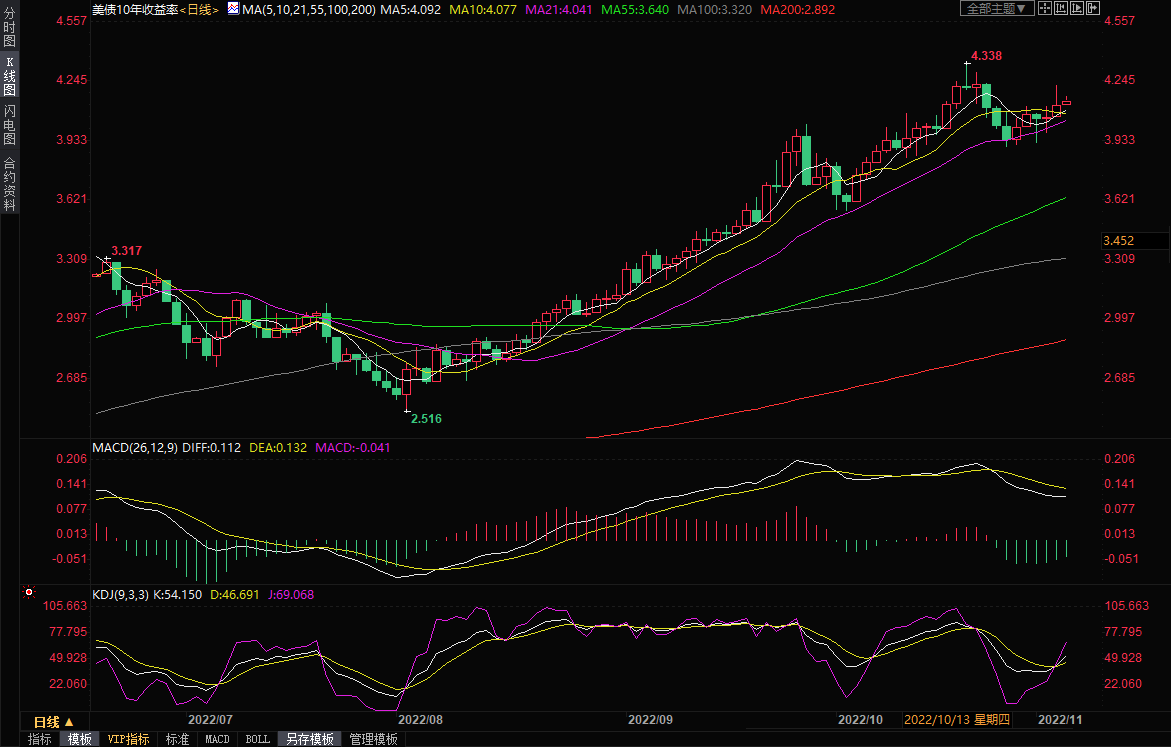 美国国债收益率周四跳涨,最高触及4.223%,距离十四年年高点近差0.11%,两年期国债收益率向5%攀升,一天前美联储主席鲍威尔表示,美联储政策利率的“最终水平”可能会高于之前的估计。