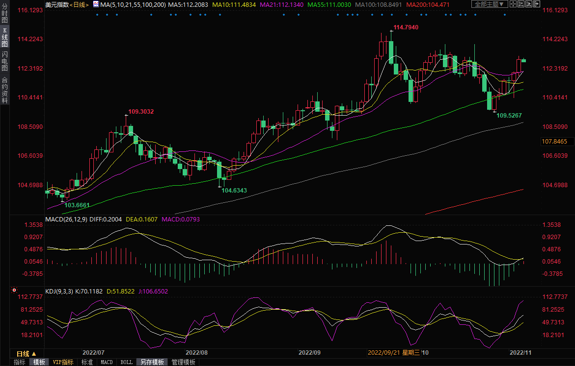 美元兑主要货币周四上涨,美联储主席鲍威尔在利率决议后的鹰派讲话,持续给美元提供上涨动能。美元指数最高触及113.15,为10月24日以来新高,收报112.98,涨幅约0.77%,技术面看涨信号进一步增强。
