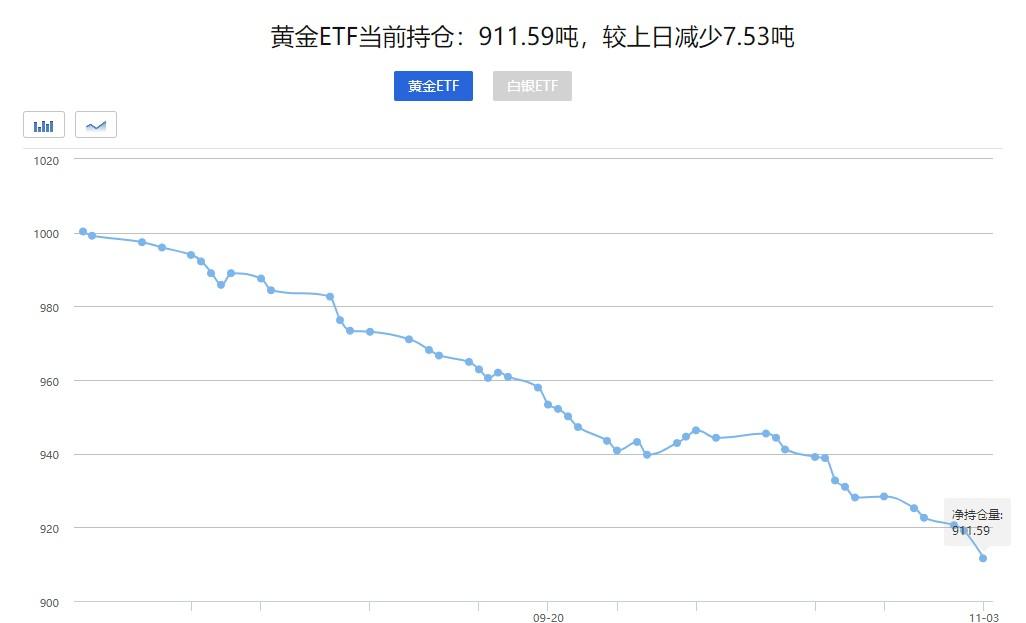11月4日黄金ETFs数据显示,截止11月3日全球最大的黄金ETF-SPDR Gold Trust的黄金持仓量911.59吨,较上一交易日减少3.48吨,为连续六个交易日下降,且再次刷新2020年3月20日以来新低。