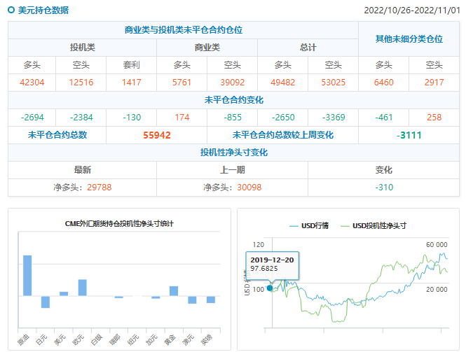 根据计算和美国商品期货交易委员会(CFTC)周五公布的数据,截至11月1日当周,美元净多头头寸骤降至30.8亿美元,为2021年8月17日来最低。 CFTC数据还显示,最近一周日元净空头合约由102618手降至77620手。芝加哥国际货币市场(International Moary Market)的美元仓位是根据日元、欧元、英镑、瑞郎、加元和澳元这六种主要货币的净仓位计算得出的。