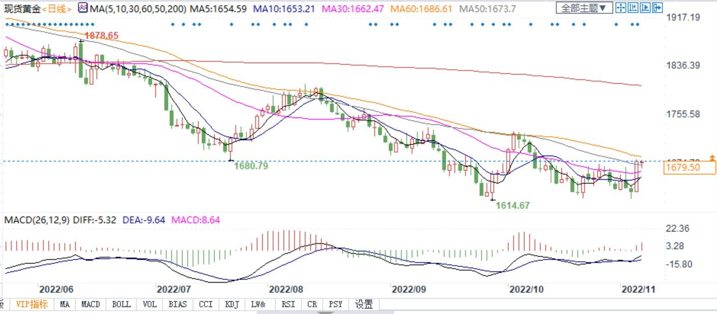 北京时间11月7日22:09,现货黄金报1680.09美元/盎司。