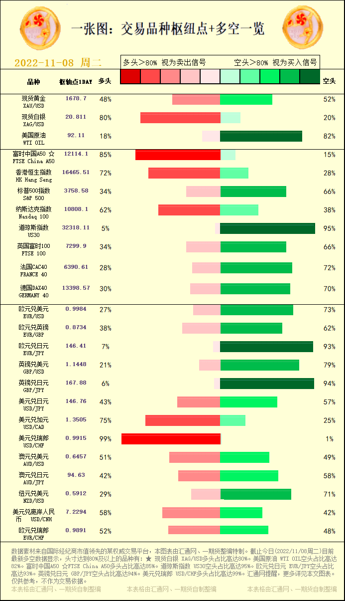 一张图:交易品种枢纽点+多空占比一览。截止今日(2022/11/08周二)目前最新多空数据显示,头寸达到80%及以上的品种有:★