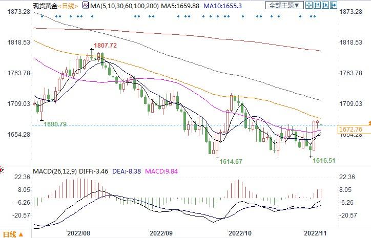 北京时间11月8日11:11,现货黄金 报 1672.76美元/盎司
