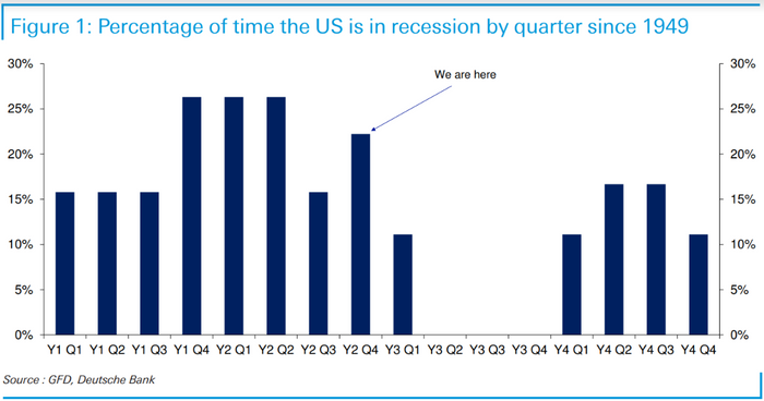 里德周三给出了一张图表,显示了自1949年以来,美国经济在四年总统周期中每个季度陷入衰退的时间占比。例如,他说,在过去的73年中,在新总统任期第一年的第一个季度,美国经济出现衰退的时间“略高于”15%。